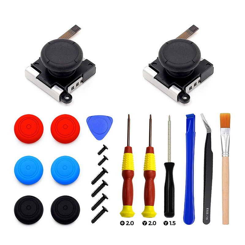 [21 in 1 Tool Kit] 2 x replacement joystick, 6 x screws, 2 x "Y" tri-wing screwdriver, 1 x "+" cross screwdriver, 1 x tweezer, 1 x pry bar, 1 x pry tool, 6 x colorful thumbstick caps and 1 brush.