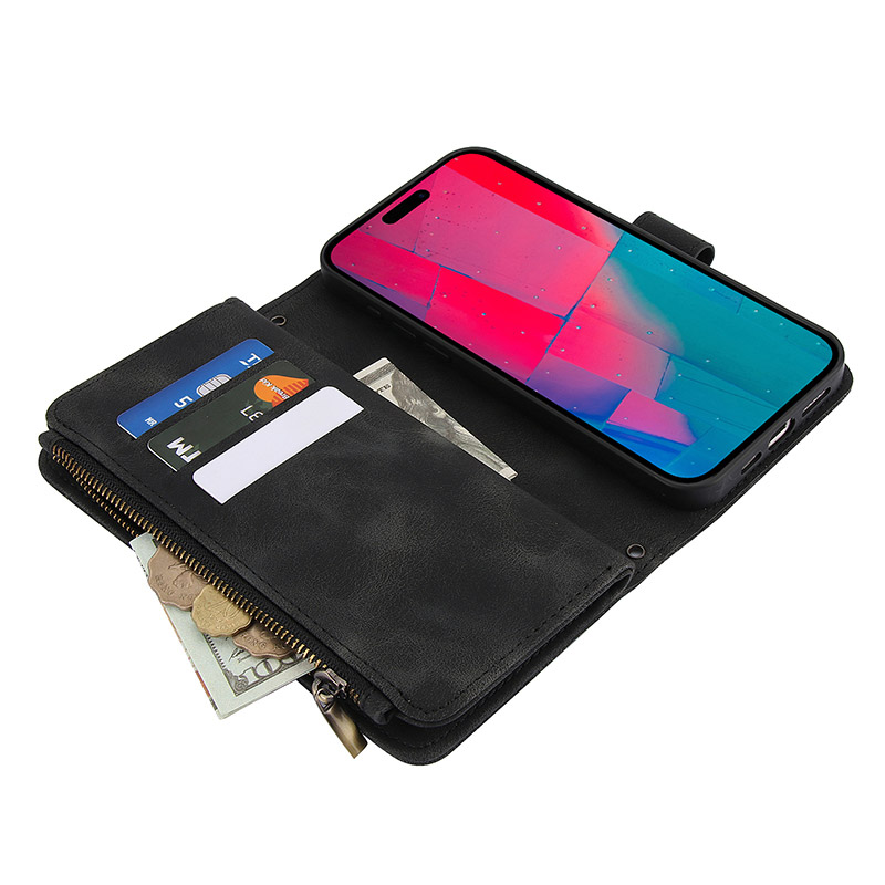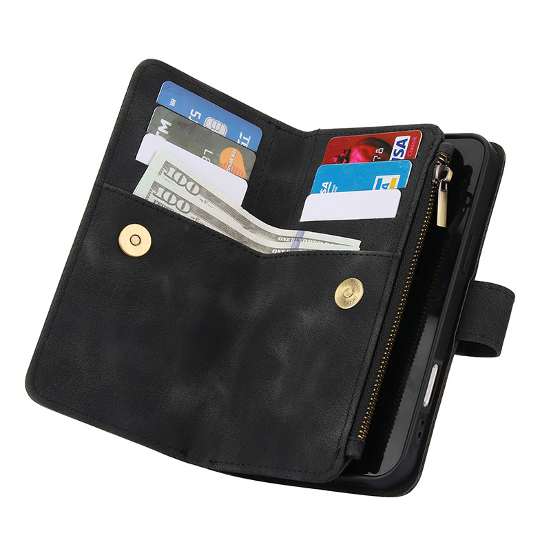 [Card Slots & Zipper & Wristlet] This case includes 9 card slots + 2 Cash Slots + 1 Zipper Pocket + 1 Magnetic Wallet for money or earphone.It also has plenty of space for your ID,credit cards,driver license,bills,coins and keys.