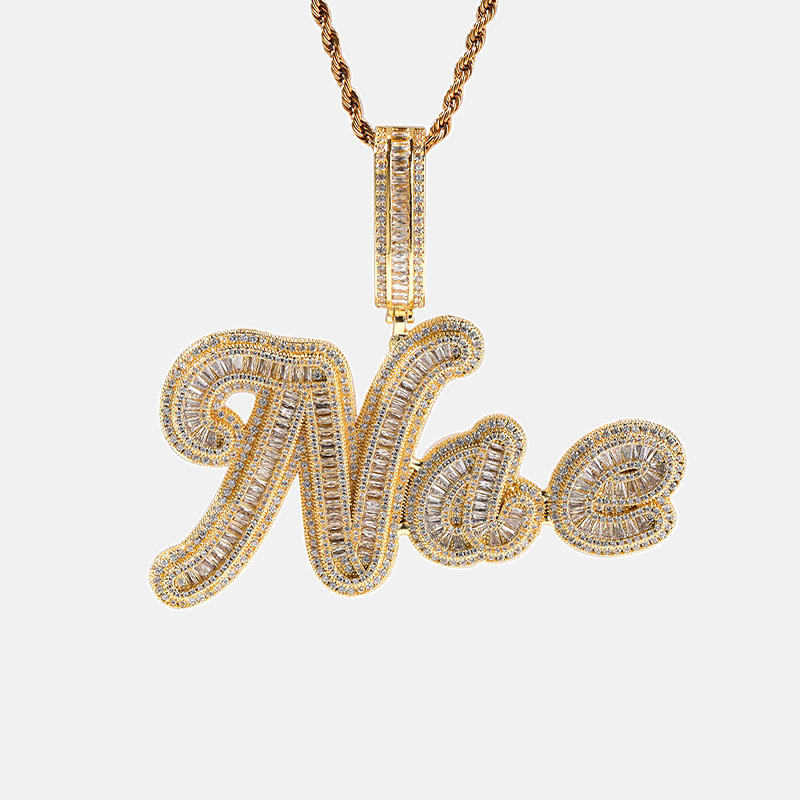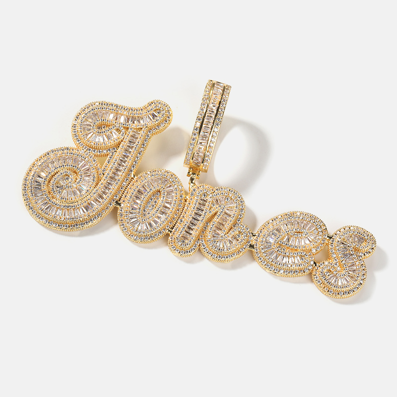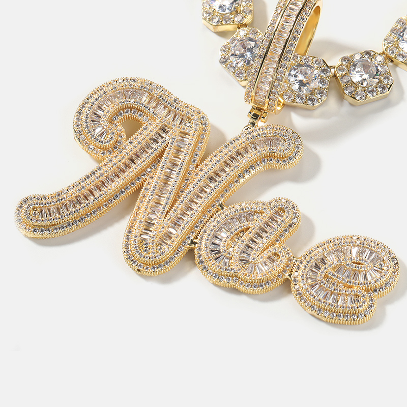 [Features & Material] This pendant's single letter width is 0.9in(21mm), height 2.2in(56mm). The chain length is 18in(45cm), 20in(50cm) and 24in(60cm). It have gold and white gold color for options. This pendant made of 18k gold plated & copper and 5A CZ zirconia, not fade, non-sensitive, harmlessful for your skin. The pendant will make you turn heads in the club, it's also great for hip-hop lovers, and rappers to wear at performance shows. Note: Dimensions of customized items are for reference only.